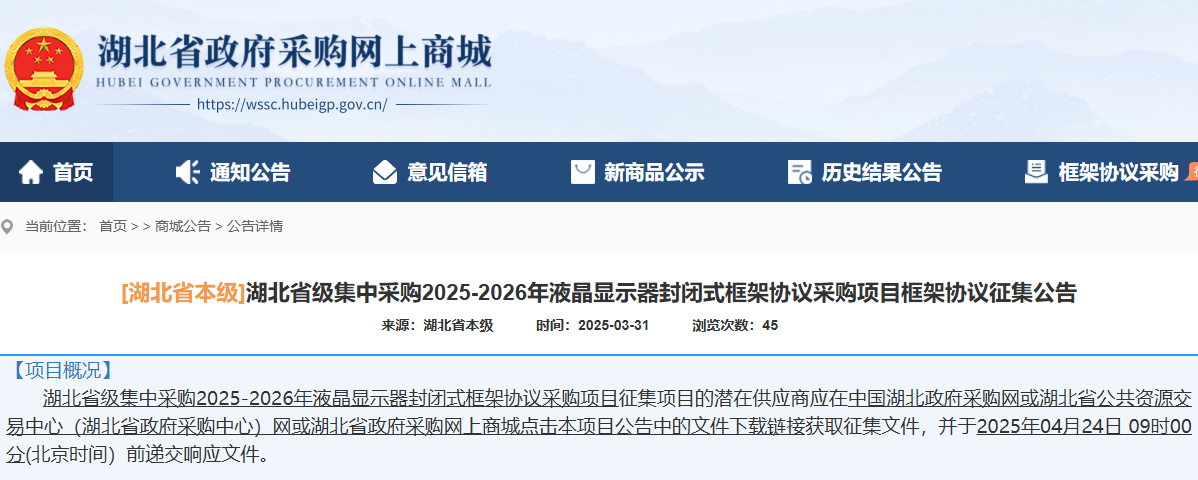 湖北省級集中采購2025-2026年液晶顯示器封閉式框架協(xié)議采購項(xiàng)目框架協(xié)議征集公告已發(fā)布,重點(diǎn)如下: