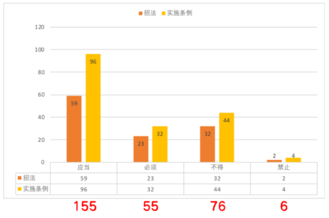 據(jù)小編的統(tǒng)計,在招法體系中,“應(yīng)當”的使用最多,共計155次,其次是“不得”76次,“必須”55次,“禁止6”次為最少。如下圖1: