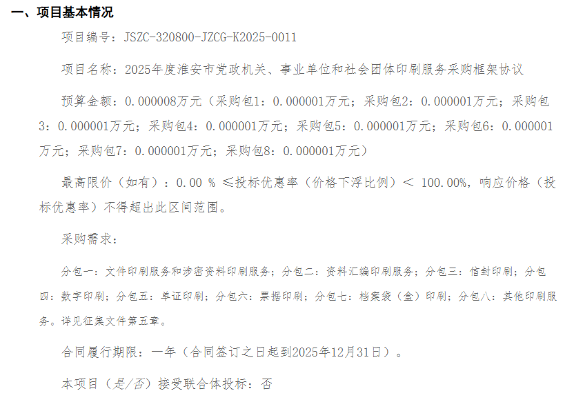 2025年度淮安市黨政機(jī)關(guān)、事業(yè)單位和社會(huì)團(tuán)體印刷服務(wù)采購(gòu)框架協(xié)議征集公告已發(fā)布,重點(diǎn)如下:
