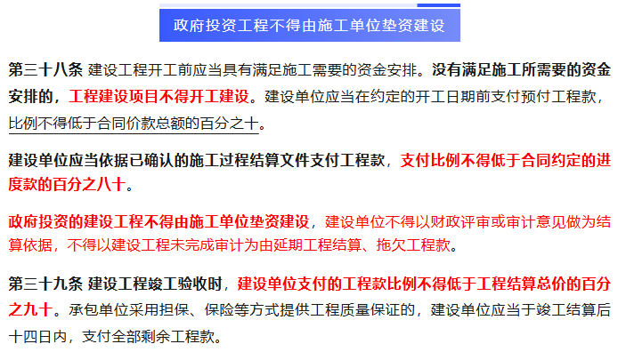 政府投資的建設(shè)工程不得由施工單位墊資建設(shè),建設(shè)單位不得以財政評審或?qū)徲嬕庖娮鰹榻Y(jié)算依據(jù),不得以建設(shè)工程未完成審計為由延期工程結(jié)算、拖欠工程款。