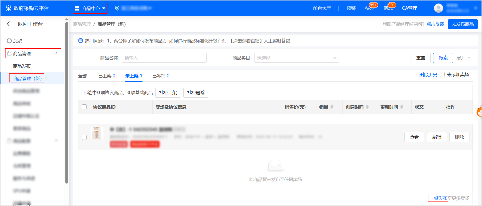 在 未上架 標簽頁,選擇需要上架的商品,點擊 一鍵發(fā)布。