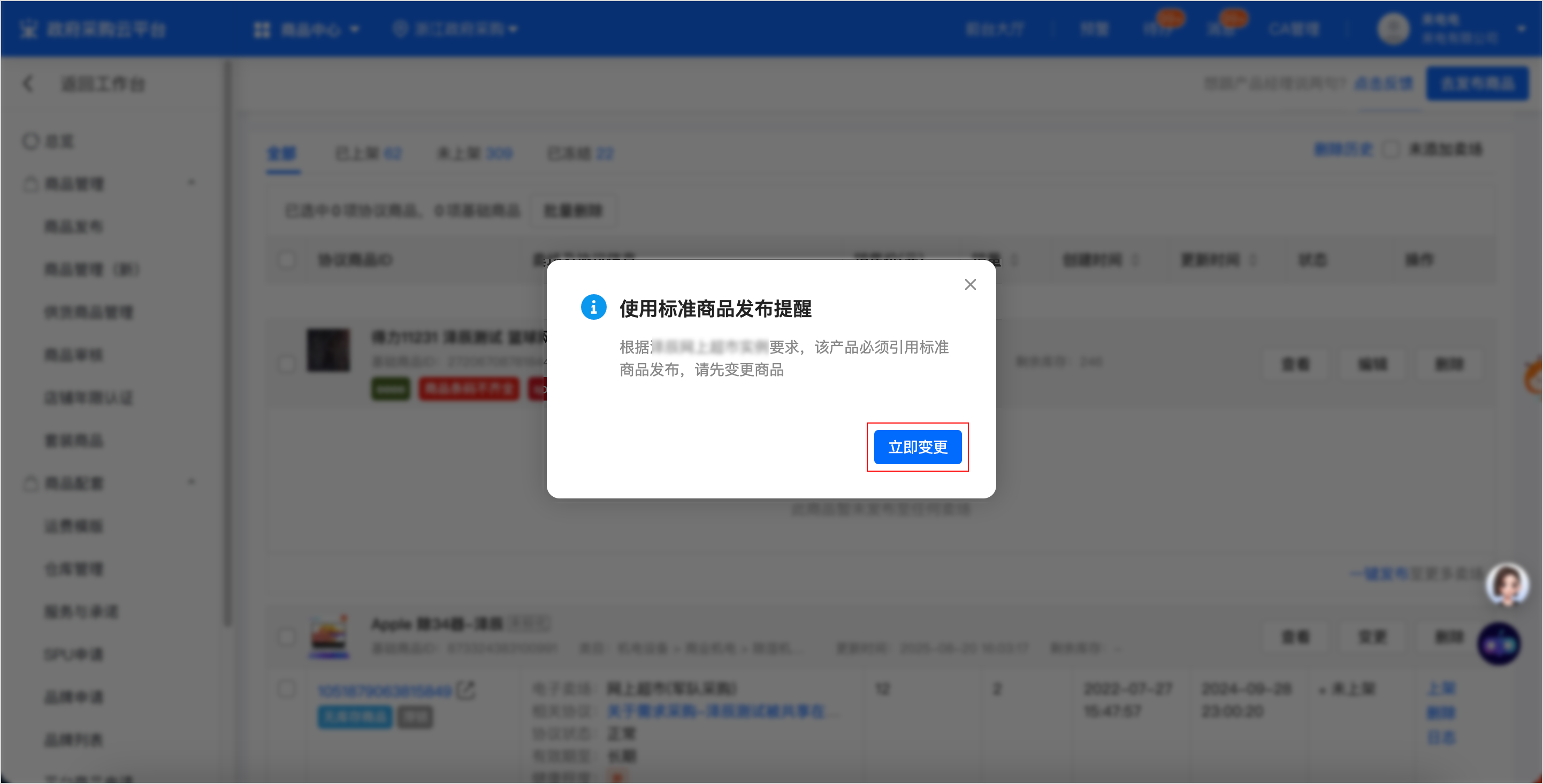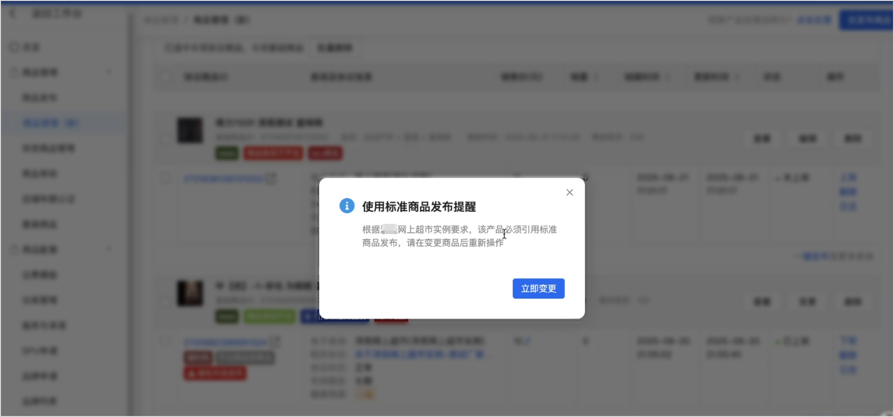 提示:根據該賣場要求,該產品必須引用標準商品發(fā)布,請先變更商品后重新操作。點擊 立即變更,按標準商品編輯并進行提交后,返回 商品管理 頁面重新選擇賣場并執(zhí)行發(fā)布,商品才會成功上架。