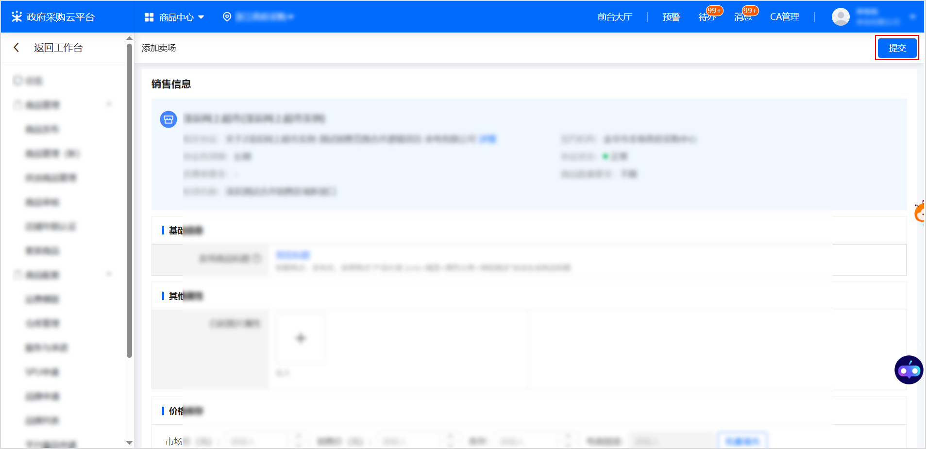 基礎商品引用平臺標準商品,則進入 添加賣場 頁面,點擊 提交。