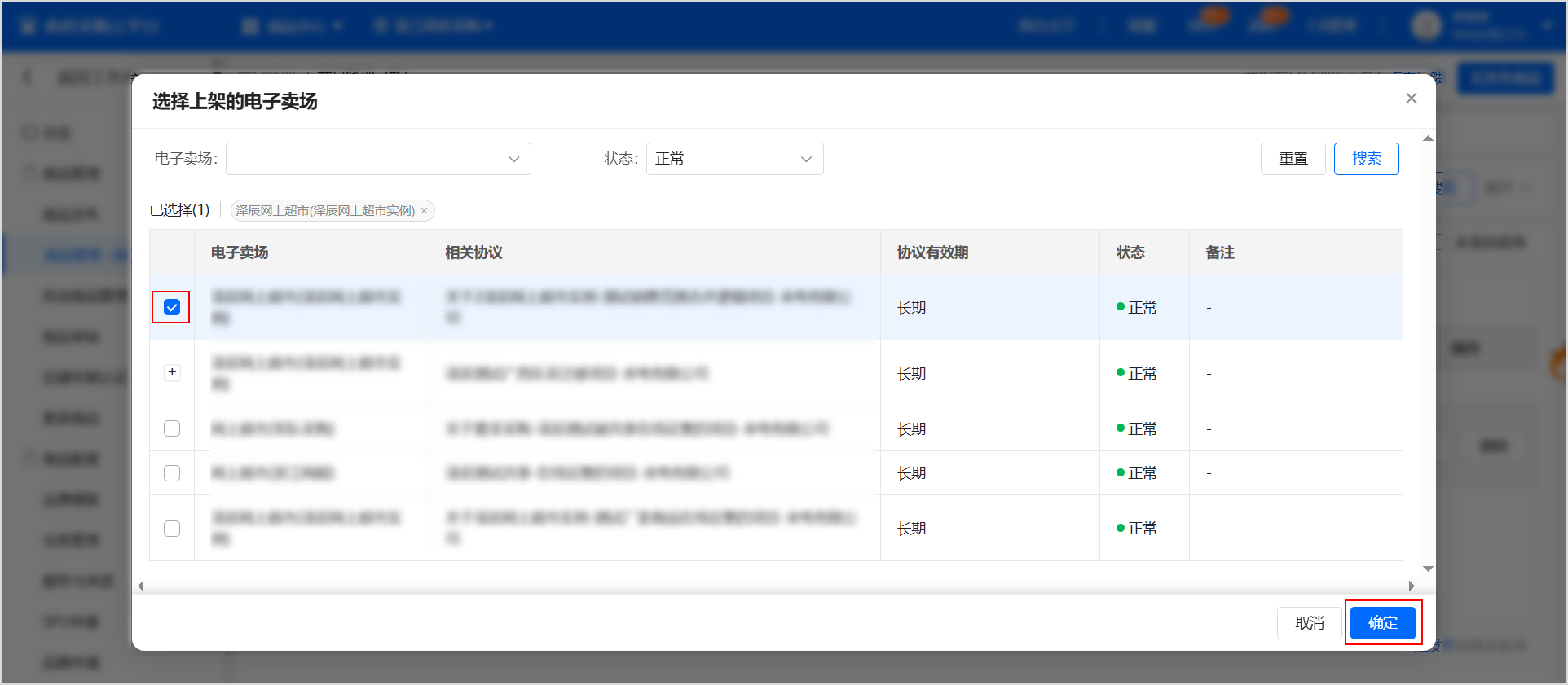 在 選擇上架的電子賣場 彈窗中,選擇賣場,點擊 確定。