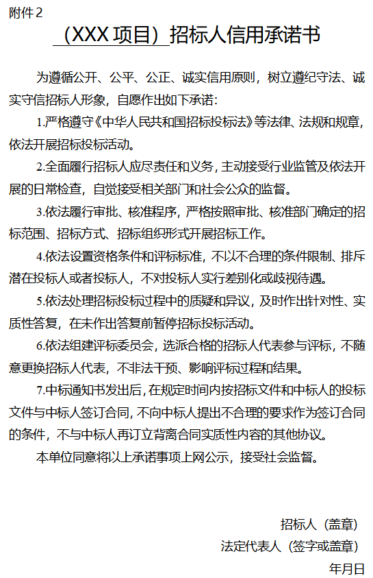 實(shí)行招標(biāo)人信用承諾制。在發(fā)布項(xiàng)目招標(biāo)公告時(shí),招標(biāo)人應(yīng)簽署《招標(biāo)人信用承諾書》,如下: